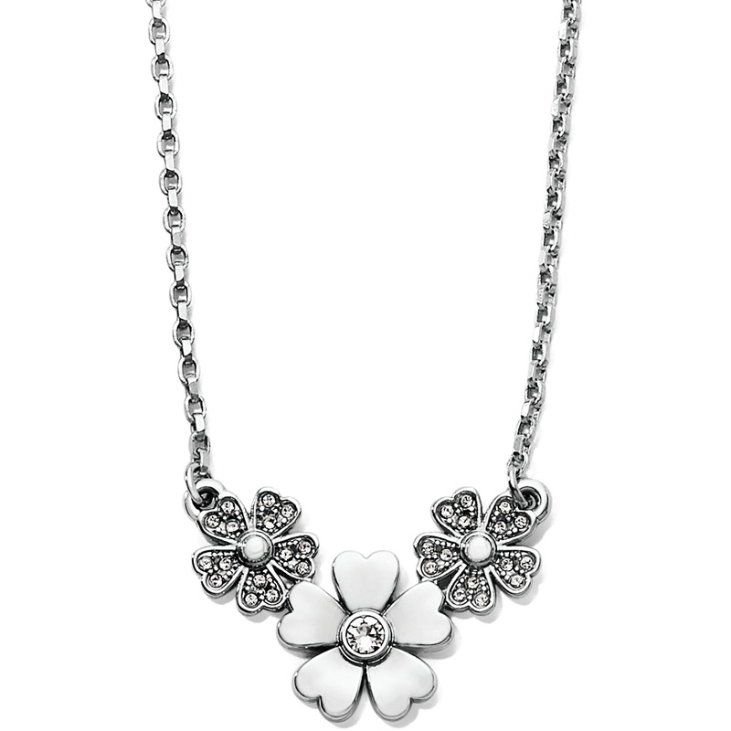 A trio of flowers sparkles and shines on this sweet and feminine short silver necklace, perfect for spring through summer!