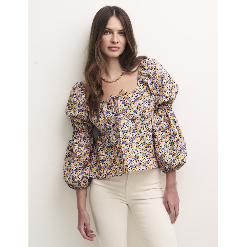 Inspired by the milkmaid look, this cute top captures the spirit of a perfect summers day. The sleeves are long and double puffed. A scoop neck designed to follow your necklaces perfectly is finished with a pretty bow tie. We also love the waist-defining p