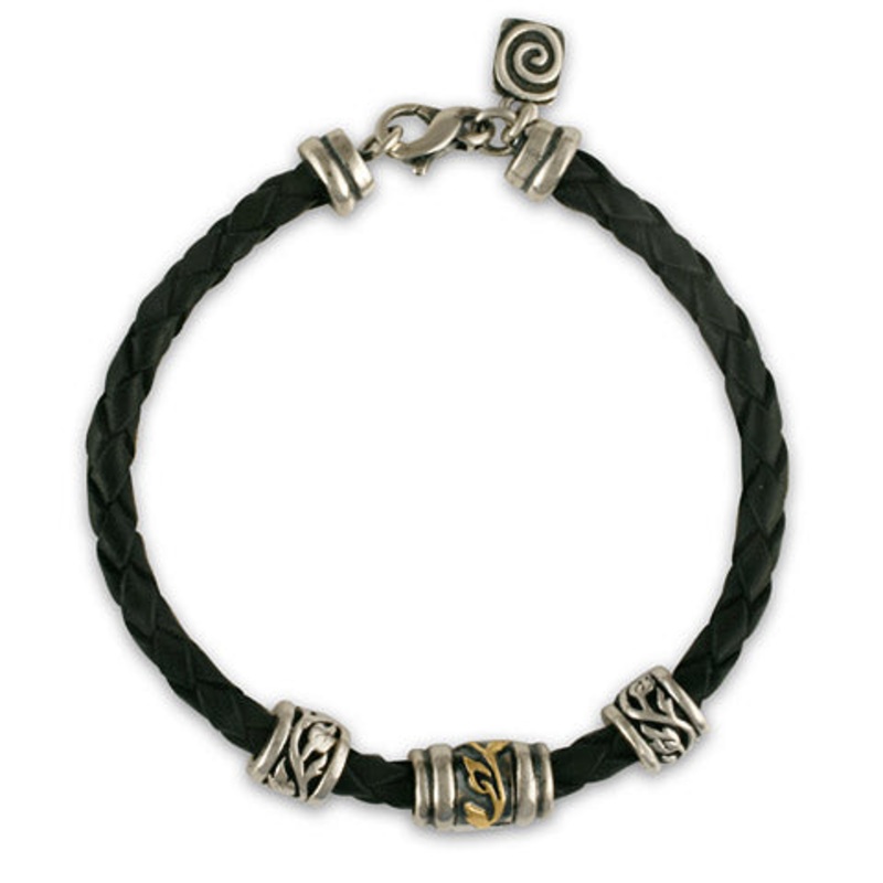 This bracelet features our popular "Flores" motif beads on braided leather. The design represents the beauty and fertility of nature, but for most people, this bracelet is just a lot of fun. The leather will soften up over time so you can wear it casually
