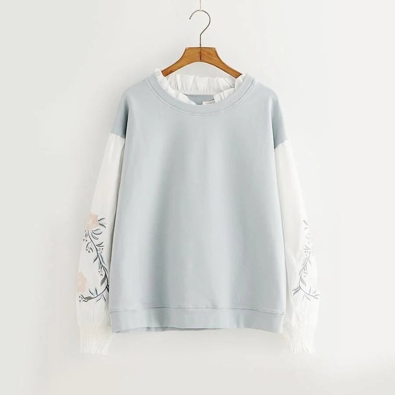 DescriptionSize ChartNote: Pls check item size chart and delivery date before ordering.Includes:Sweatshirt Product ID:J40032.Materials:Cotton.Sleeve Length and style:Long and Normal sleeve.Pattern:Flower.Color:BlueSeason:Spring,Autumn,Winter.Women/ Flower