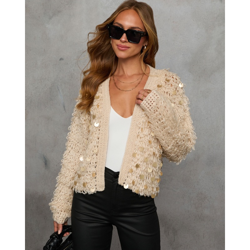 Celebrate the moment in a piece thats as fabulous as the night ahead with the For the Moment Shaggy Sequin Cardigan. Perfect for a chic NYE at home, this standout piece features soft shaggy knit fabric with sequin details that add playful movement to every look. Whether youre sipping champagne on the couch or hosting a low-key gathering, this cardigan pairs effortlessly with jeans, leggings, or even a slip dress for a comfy yet stylish vibe.