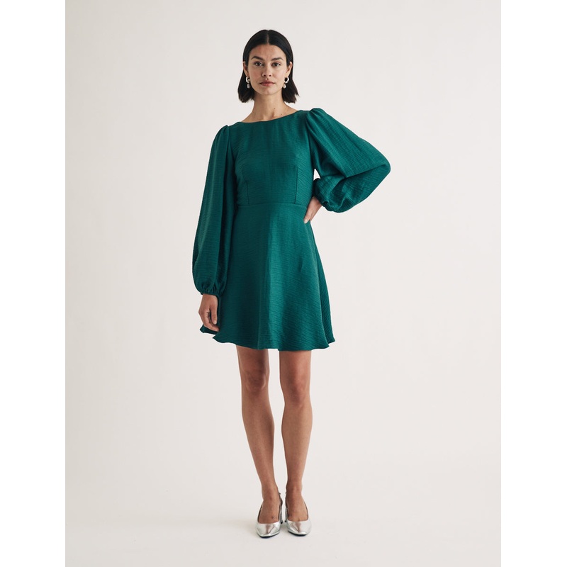 Our Zola mini is sure to turn heads. With signature voluminous sleeves, this dark green dress twirls to show off an open back that ties together with a neat bow. Style yours simply with barely-there heels. A piece this standout only needs minimal accessories.