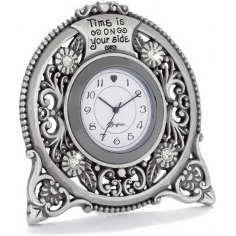 This gifted timepiece features gorgeous scrolled and floral accents and the inscription " time is on your side"."Width: 3"Height: 3"Depth: 1/8"Face Diameter: 1"Material: Swarovski CrystalFinish: Silver platedFeatures: Swivel armIncluded: Battery included
