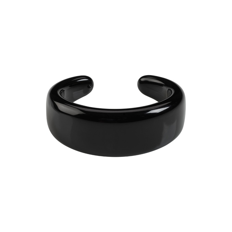 Boost your style! This black acrylic bangle, designed in collaboration with Freja Wewer and , boasts a chunky yet sleek silhouette. Wear it alone for a bold statement or stack it with other bangles for a unique, personalized touch. Pair it with a cropped s