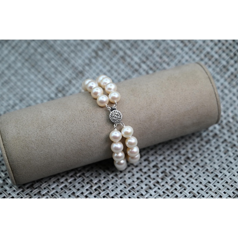 This double strand fresh water pearl bracelet has pearls that are between 8.5-9.0mm in size. The clasp is made from 14k white gold and is 8 inches in total length.