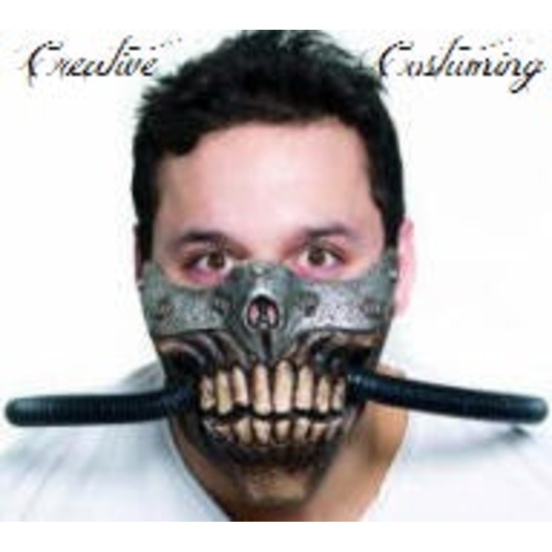 Molded latex mask with plastic tubing that goes around back of neck with elastic security band.