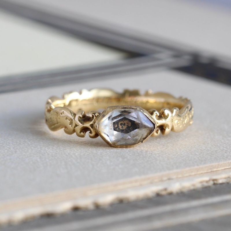 This is what antique jewelry collectors sometimes refer to as a “grail piece”: a rare Georgian Stuart crystal mourning ring, featuring a classic memento mori symbol of a skull & cross bones (likely painted on paper) under faceted rock crystal.