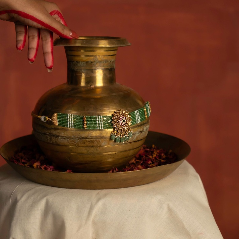 Stones:Red Kundan Stones, Green Kundan Stone, Green Beads, and Pearls.