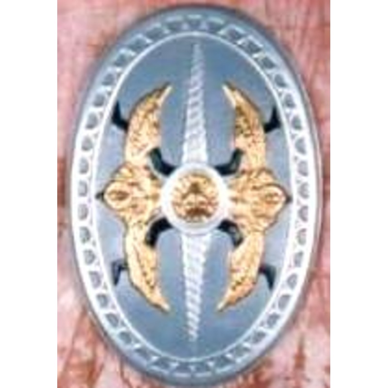Silver Oval Shaped medium weight Plastic Shield with Gold Roman Deco & hand strap.24″ x 17″