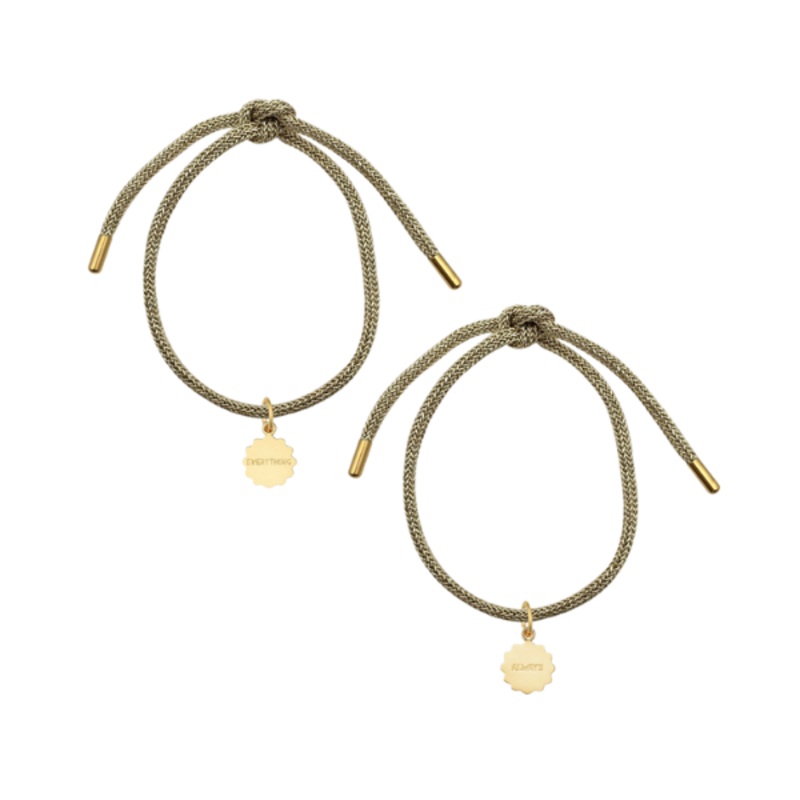 This bracelet set features our matchingEverything DiscandAlways Disc on our Gold Lurex Bracelet Cord.Everything:Youre everything to me. I want everything and wont settle.Always:I am always there for you. I will always stay true to myself.These words have d
