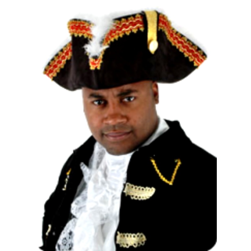 Authentic style Tricorn military design from the 18th century. Ultra suede black hat w/red & gold laced ribbon trim, fabric lining & elastic cotton sweat band.No self respecting Govnah would be without this status symbol. Good for 18th century military, po