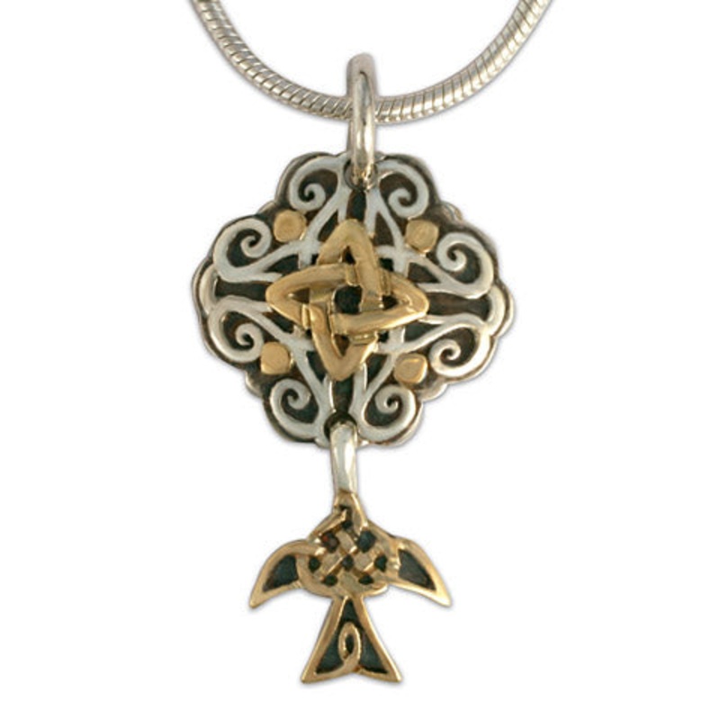 A delicate swallow glides below a cloud of grace within this pendant. The swallow is formed by an intricate golden knot, and the cloud from our Shona design, casted in silver. The center is accented by a golden star knot, and further still with a quadrant