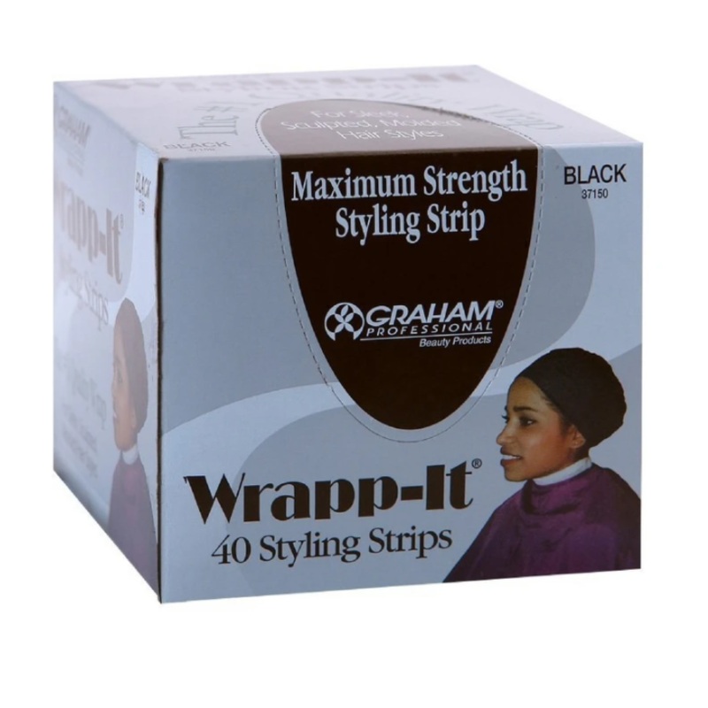 Wrapp-It Black Styling Strips are manufactured using a blend of dyes and pigments that won’t bleed during use. These strips are made of a soft, high-stretch creped tissue paper that comes from a proprietary dye blend. These strips are comfortable against clients skin and feature a superior stretch to ensure a secure wrap. Wrapp-It Black Styling Strips can also be used as a based for glue-in hair weaves. The simple, effective way to wrap sleek, sculpted and molded hairstyles with confidence.