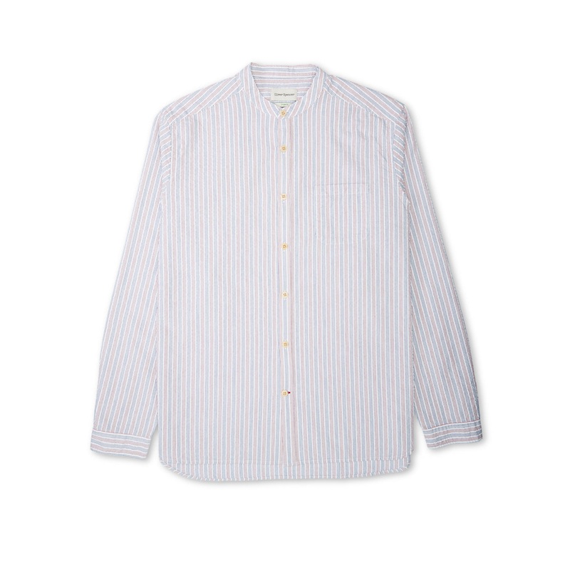 Born of utilitarian origins, the grandad collar has become a workwear classic, dressing down the archetypal men’s shirt to something altogether more relaxed. This version has been cut in a lightweight, tight-striped organic cotton seersucker, perfect for the warm summer months and great worn with ‘s relaxed tailoring.