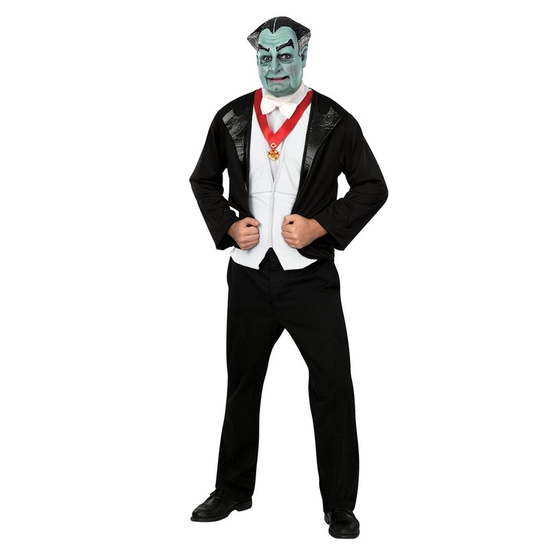 This family is not like any other – the oddball neighbors in your neighborhood look conventional compared to The Munsters! The irritable and sarcastic father of Lily Munster, Grandpa is an undead vampire. Buck convention in this classic Munsters Grandpa costume for a ghostly good time this Halloween.The officially licensed The Munsters adult Grandpa costume includes a 100% polyester black jacket with attached gray vest, white dickie and medallion on a red ribbon; the costume is completed by a greenish character half mask. Shoes not included.