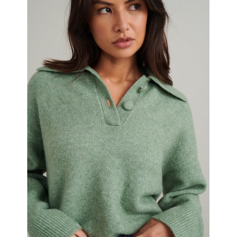 A chic take on a so-now sporty style. Our green polo jumper promises to be your go-to knit for the season. We love the classic collar, covered buttons and ribbed cuffs. Wear with your favourite NC denim jeans.