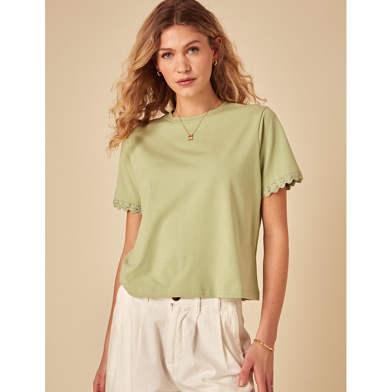 A staple tee, but better. Coming in sage green, this ones got delicate crochet trim for an elevated touch. Just add denim.Round neckShort sleevesDesigned for a close cutSize tip: we recommend your usual size
