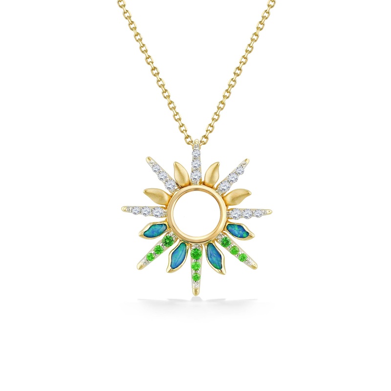 14K Yellow Gold Green Flash Sunset Pendant with Opal Inlay, 0.14 Carats (total weight) of Tsavorites, and 0.16 Carats (total weight) of Diamonds. 17″ 14K Yellow Gold chain included. The pendant measures approximately 13/16″ in width.