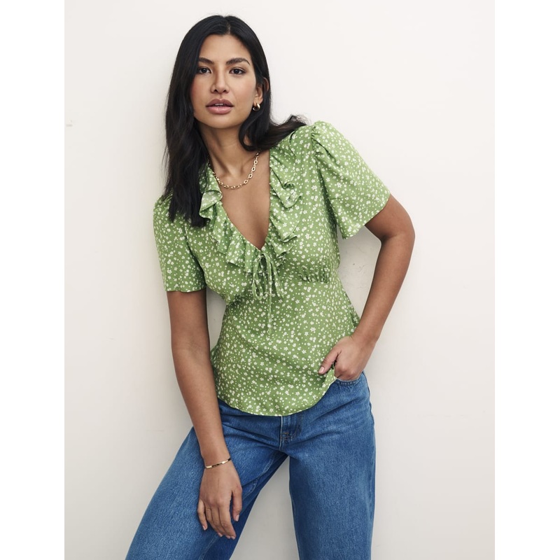 Every wardrobe needs a cute top like Joley. We love the green ditsy floral print and the figure-skimming fit. Team her with jeans for that dinner date coming up. V-neck Fluted sleeves Under bust seams designed to flatter String tie detail