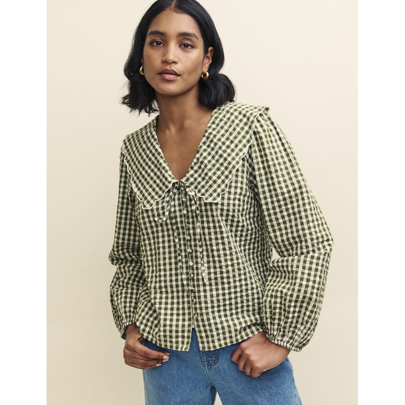 The Peter Pan collar is here to stay. This season the trend is back with a delicate scallop trim, string tie detailing and fabric covered buttons. Expertly crafted from cotton, the gingham this green and white shirt is made from is certified. Style yours with layers of gold jewellery.