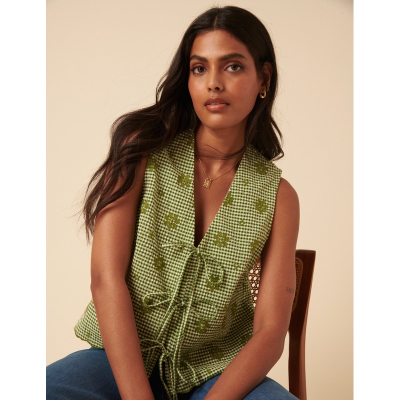 In green gingham with a trio of ties, this top is effortless. We love the embroidered floral detail and scalloped hem too. Just add jeans. V-neck String tie detail Designed for a relaxed fit Size tip: we recommend your usual size