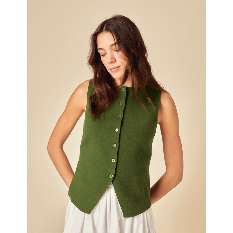 The layer youll keep reaching for. In olive green, this fine knit waistcoat features a high neck, delicate button-down detailing, and a hem that dips into an inverted V. Were styling ours with a white skirt for a fresh, effortless look. Crew neck Button fr