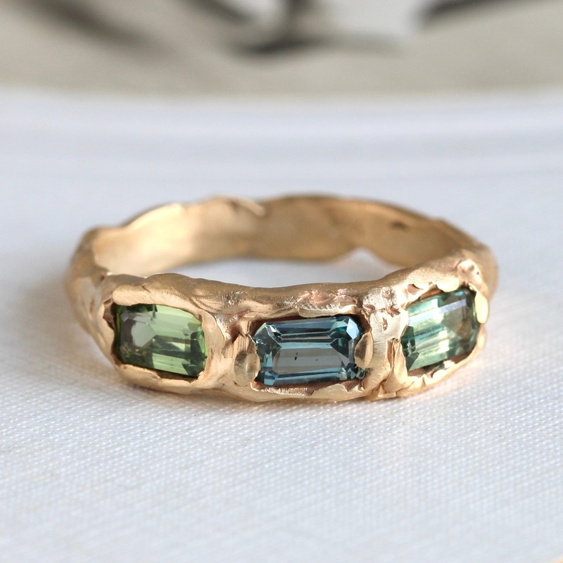 A three stone stacking ring that’s a slightly chunkier version of our original trilogy band. Designed in our signature organic style with hand-hammered texture, it’s set across the front with a trio of baguette-cut natural sapphire, in shades of softly glowing green and blue.