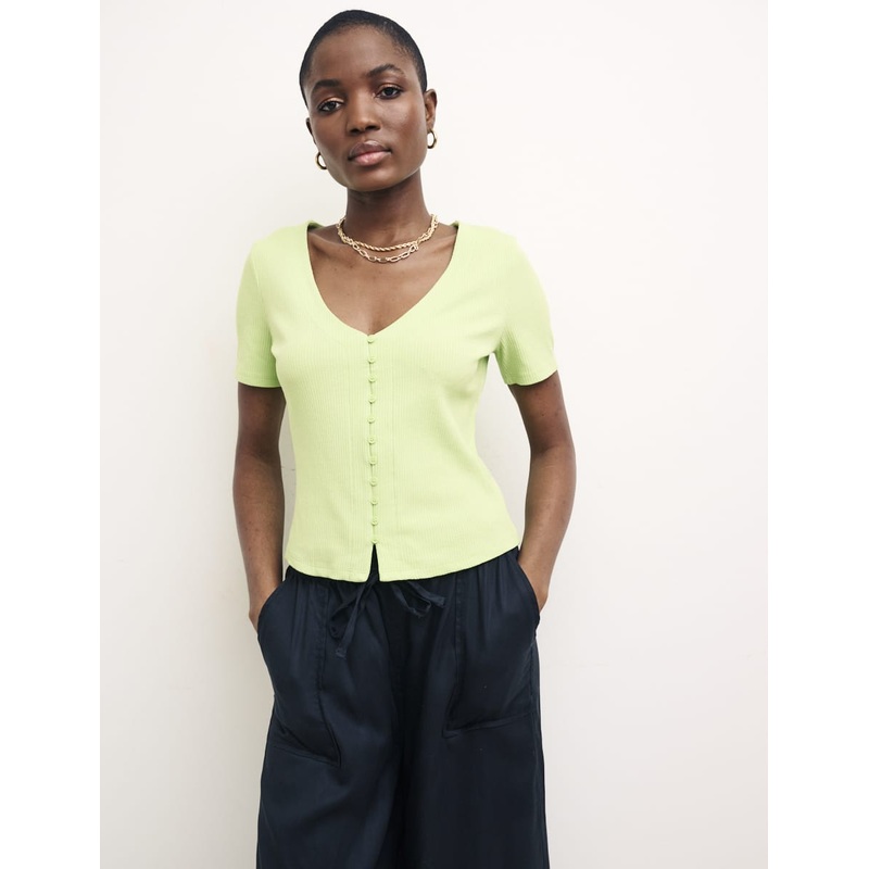 Crafted from ribbed jersey. Its shaped with short sleeves for easy year-round layering. Keep the look casual with wide leg trousers.V-neckShort sleevesButton frontSoft stretch fabric
