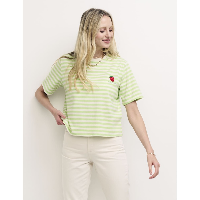 Fresh in: we love this tee finished with an embroidered NC strawberry and zingy green stripes. In a relaxed boyfriend cut, its perfect for doing wholesome weekend things. Style yours with cream denim. Round neck Short sleeves Relaxed fit
