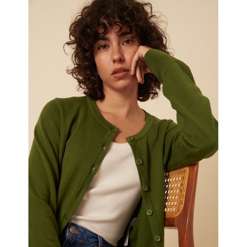 Meet your new cardigan crush. This button-up olive green cardigan is the perfect layering piece. We love the crew neck and ribbed trims, and its super soft to the touch. Wear yours with jeans for a laid-back look.