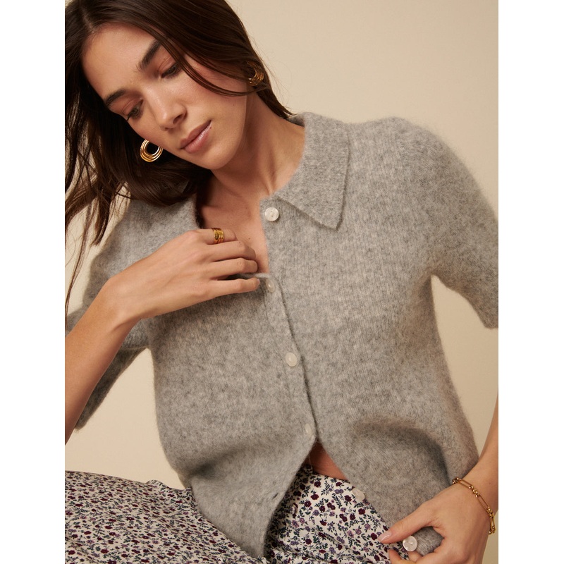 The softest cardigan. Coming in grey, we love the collar and contrast button front front. It features short sleeves that finish just above the elbows. Were wearing ours with a skirt and ballet flats. Collar Short sleeves Ribbed trims We recommend folding y