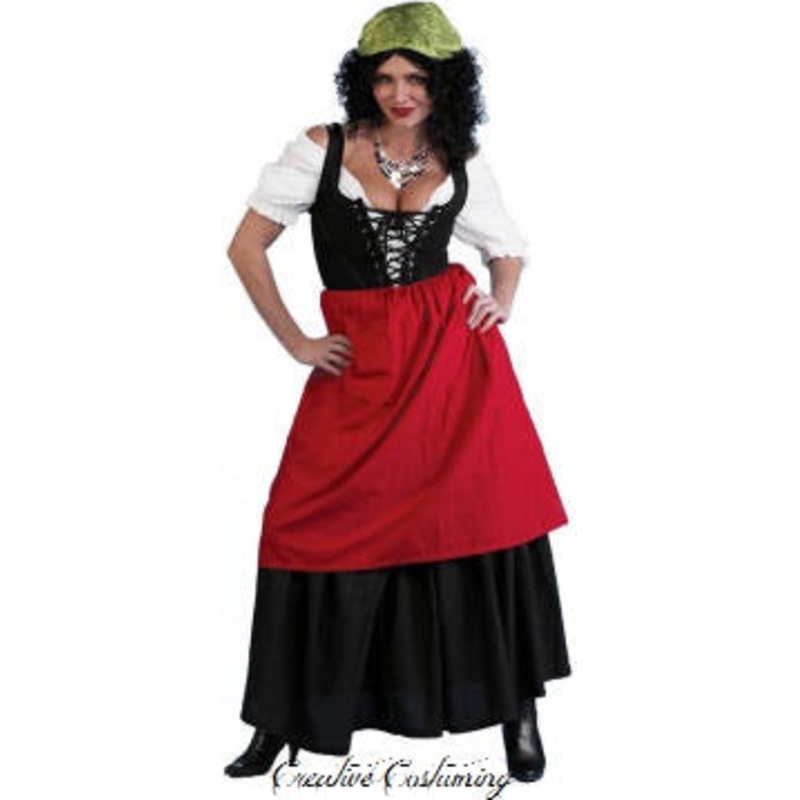 Includes: White Blouse accented w/ruffles, Black Front Tie Corset, Full Length Black Elastic Waist Skirt & Red Elastic Waist Apron.