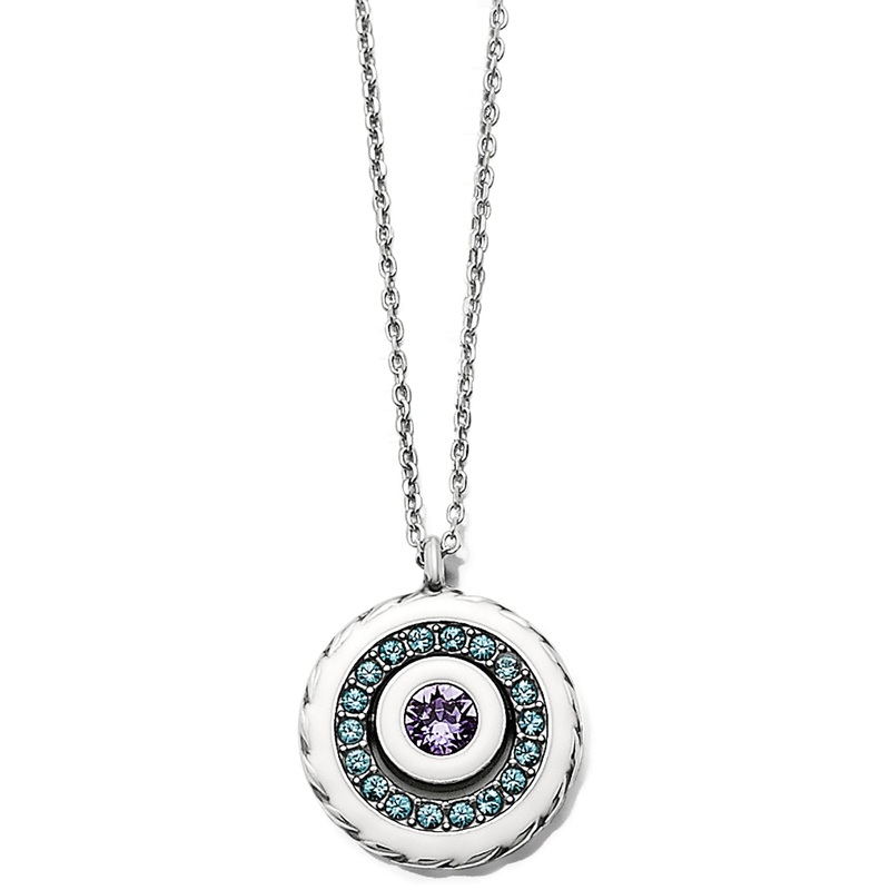 Concentric white halos of hand-applied enamel add a subtle framework to twilight-hued Swarovski crystals on this silver pendant necklace. Petite, and perfect for layering!
