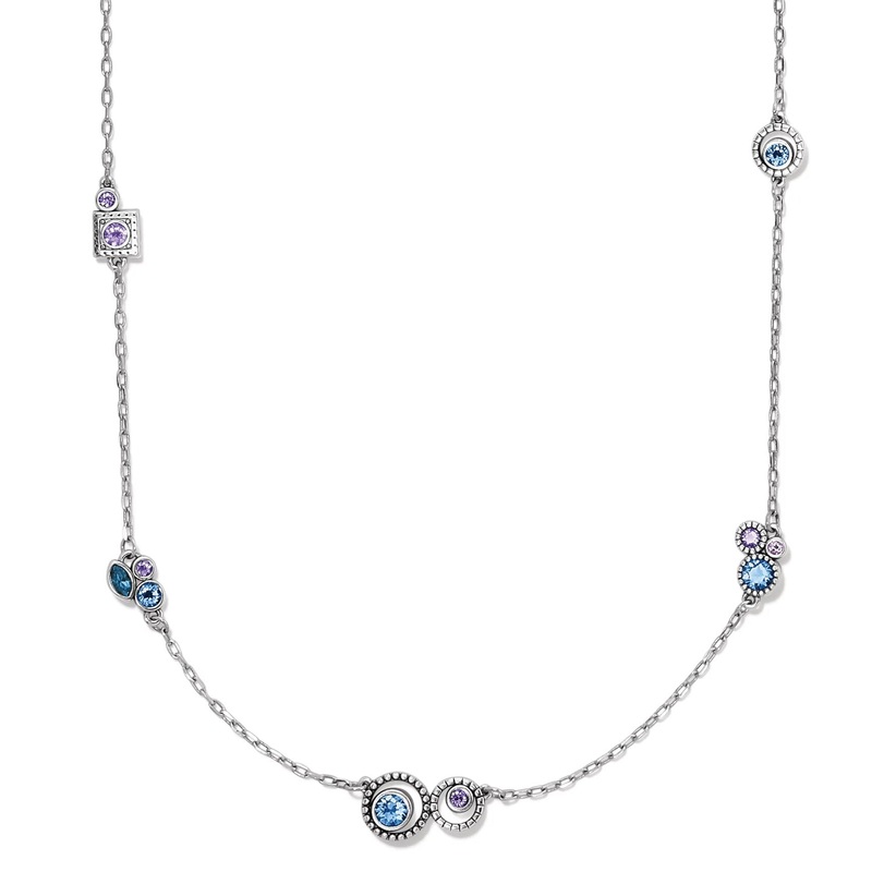 Like the orbiting stars that inspired its design, this necklace with hand-set fine quality crystals in shades of blue will send your spirits soaring.Style: #JM4563Color: Silver-TanzaniteClosure: Lobster ClawLength: 24" - 26" AdjustableMaterial: Fine qualit