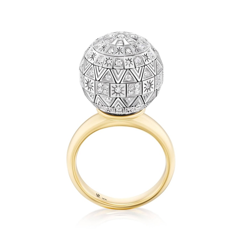 18k yellow gold ring with a disco ball covered with pave diamonds.