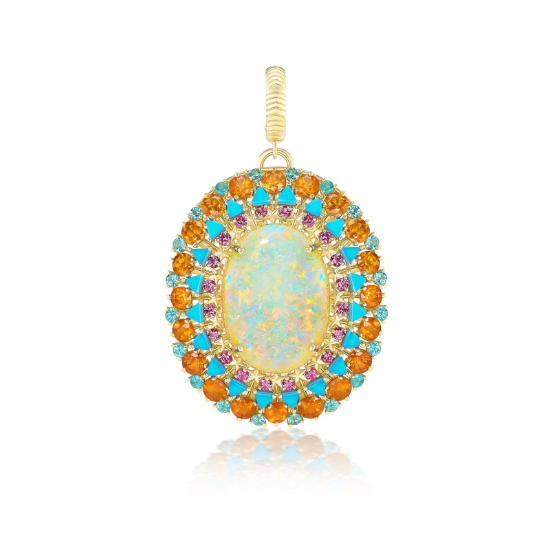 18k yellow gold supernova pendant featuring an oval opal surrounded with pink spinel, paraiba, mandarin garnet, and turquoise stones. This pendant is meant to celebrate the magic in the universe.