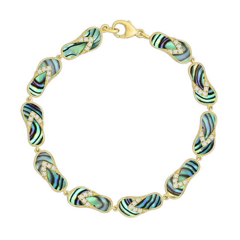 14K Yellow Gold Hawaiian Slipper Bracelet with Abalone Inlay and 0.50 Carats (total weight) of Diamonds. The bracelet measures approximately 7.50" in length.