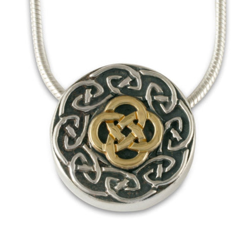 Helios: This knot is one of Helen’s favorites for bordering or surrounding a piece of jewelry. If you trace the path of the line, you find that it flows in a gentle sine wave, and then suddenly turns back, zig-zags, and then continues on its way. This pattern suggests a way of moving through life. There are cycles of flowing gracefully ahead, and there are cycles of looking back and reviewing, and perhaps re-experiencing from a new viewpoint, integrating, or at least slowing down to really behold, and smell, the flowers.