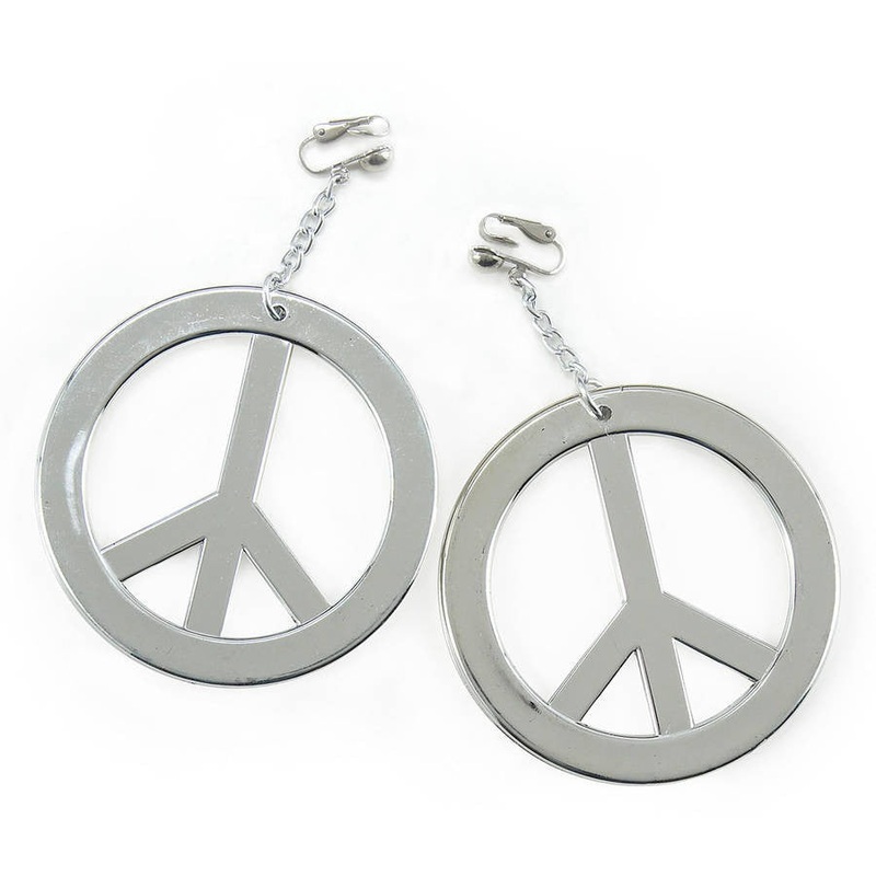 Complete your Hippie or war protester costume with these silvery Peace Sign earrings. Groovy! The Peace Sign earrings are made of a silvery plastic and are clip on, so everyone can wear them.