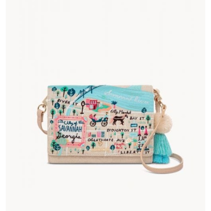 Inspired by jet setting to the four corners of the world, this Embroidered Convertible Crossbody gives you four looks in one: wristlet, clutch, short shoulder, and crossbody! Designed with our Spartina hardware set upon a magnetic closure, open the embroidered top flap to reveal a front slip pocket, 8 card slots with RFID lining, a bill slot, and one more hidden slip pocket behind a zip pocket. It comes with a darling enamel pin to mark your favorite destination!