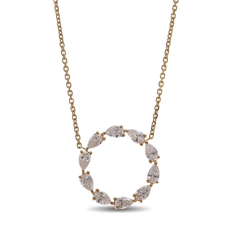 A beautiful hoop diamond pendant featuring 1.20ctsG-H color pears styled in shared prongs and mounted in 18K yellow gold.
