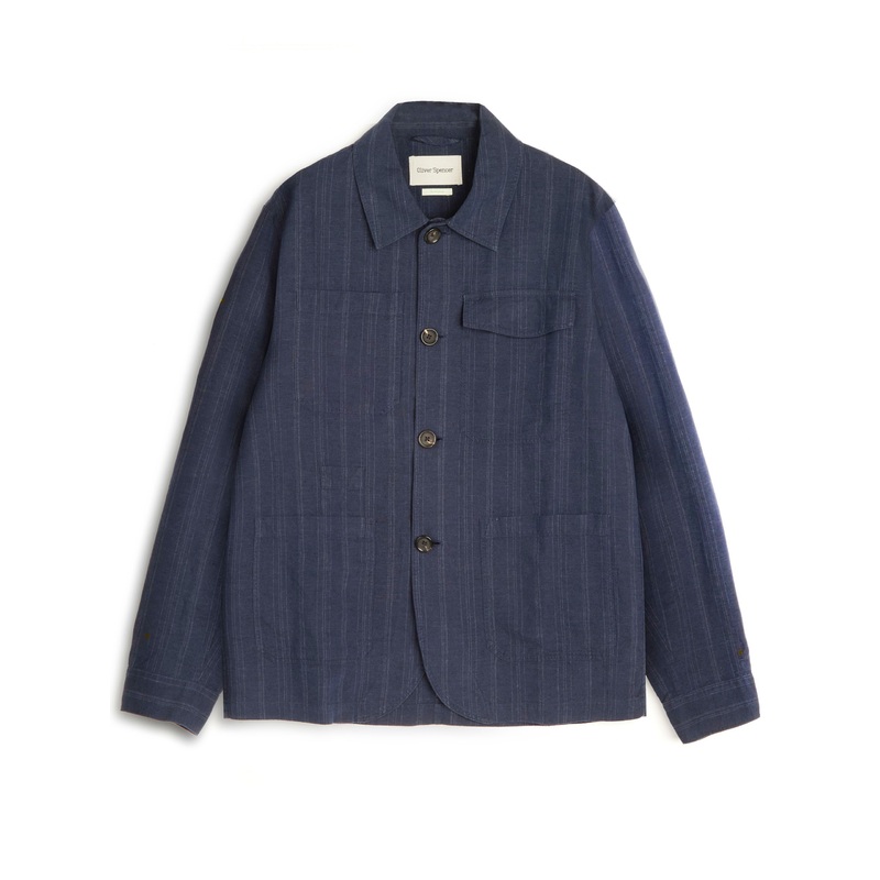 The Hythe jacket is a modern iteration of the chore jacket. This style has been constructed from a beautifully soft blue cotton and linen fabric. Functionality comes via four front patch pockets, two rear patch pockets, and a pen pocket.