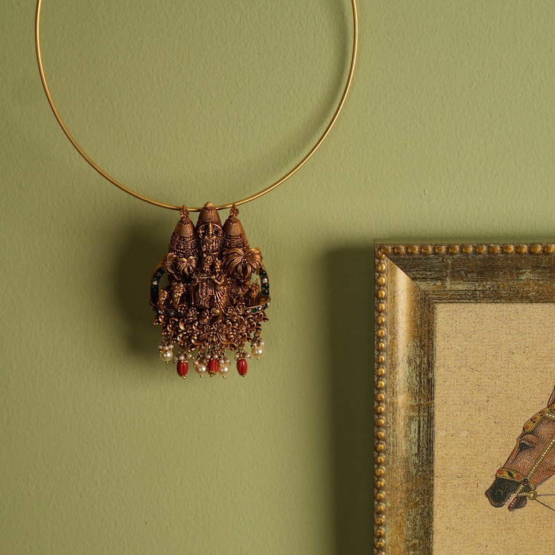 The Indhuja Pendant showcases the values of traditional artistry and cultural elegance. This 92.5 Sterling Silver piece boasts an elegant 22ct gold plating, while featuring White and Green Kundan stones, Red beads and Pearls all featured for a striking combination. It has been designed with single and dual hook system at the back so that you can either easily thread a chain through the single hook or securely tie the chain through both hooks. The Indhuja Pendant is perfect for all festive occasions, weddings or cultural events. This extraordinary piece enhances your ethnic outfit with splendor.