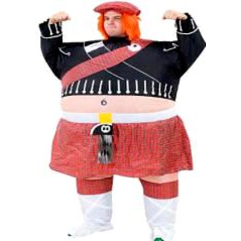 Includes: Self inflatable Scottish Highlander, hat, battery pack and battery-operated fan. Just slipthe costume on, turn on the fan, zip up, and watchthe costume inflate in seconds. Walking, dancing, sitting, and standing are all comfortable and easy asthe costume deflates and inflates with your movement, thanks to the continuously blowing fan.