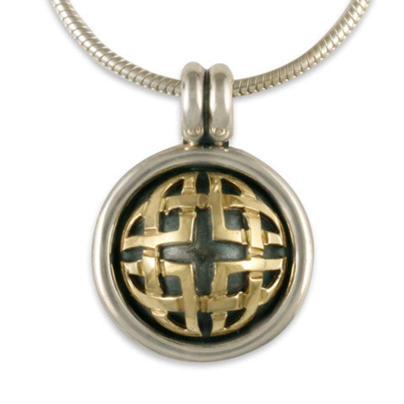 The Interlace Pendant a classic round pendant that is sophisticated and versatile, a two tone piece perfect for work or for an evening out on the town. It features solid 14K gold knot work overlaid upon antiqued sterling silver. The circular pattern symbolizes harmony in relationships. Handmade in our studio in Santa Fe, NM.14K Gold over Silver.