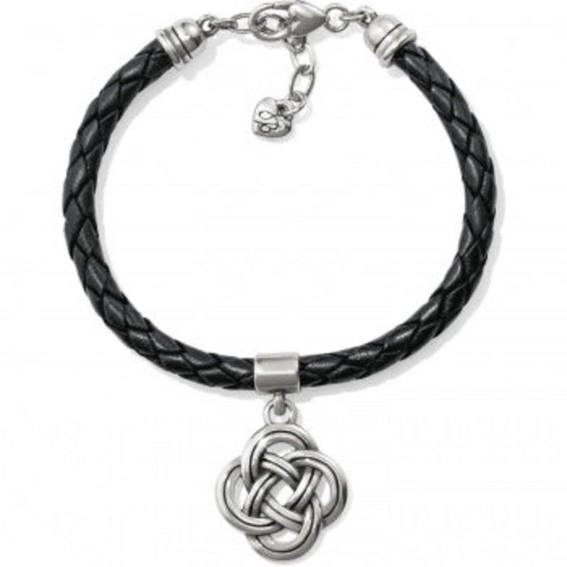 A simple silver-plated Celtic-inspired knot hangs from a braided leather strap, giving this bracelet both a classic and contemporary feel.Width: 1"Closure: Lobster ClawLength: 7 3/4" - 8 3/4" AdjustableMaterial: LeatherFinish: Silver plated