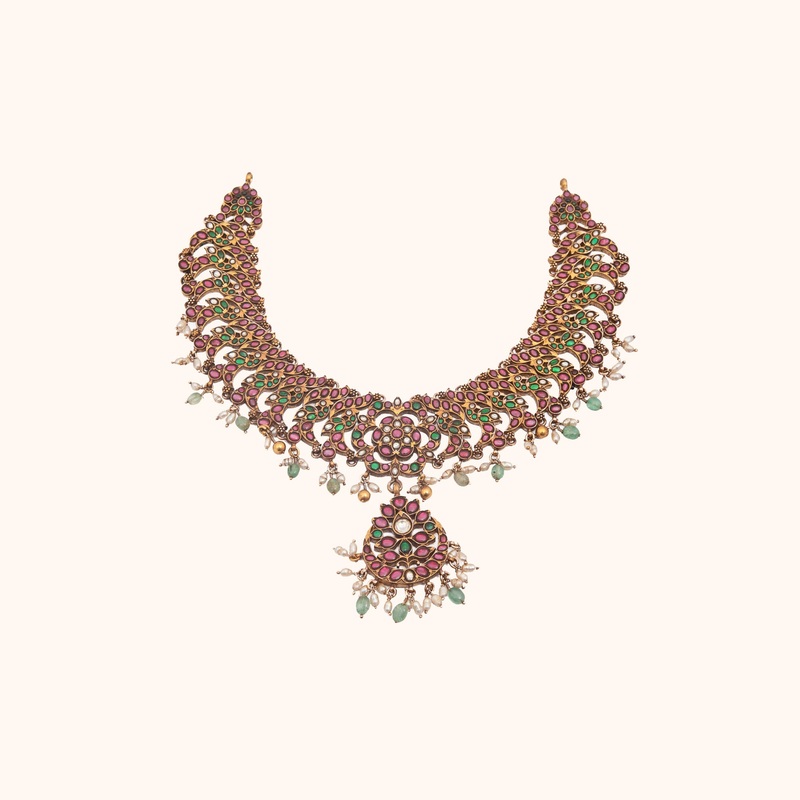 Shop Jaari Red and Green Kundan Grand Necklace in Chennai Silver with 22ct Gold PlatingFor celebrations that demand pure magnificence, the Jaari Grand Necklace is your definitive statement. Masterfully handcrafted from 92.5 Sterling Silver, it is bathed in