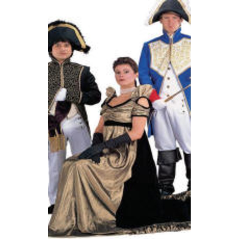 Circa early 1800'sIncludes: Antique gold lame and black velvet gown with empire waist and flowing ruffle-edge train.Color: As Shown Size: S (6-10), M (10-14)