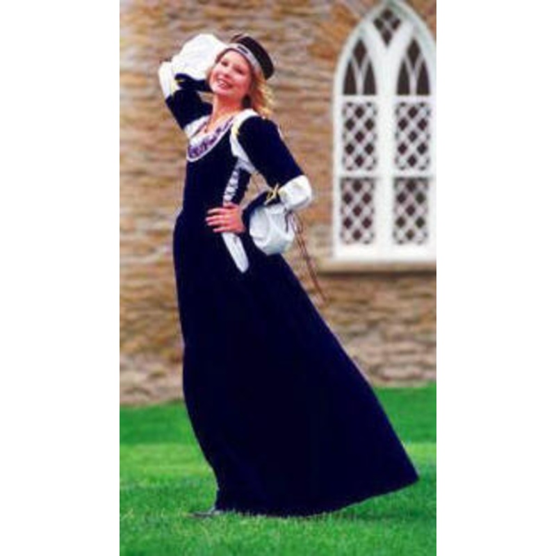 This gown has sleeves that tie on with ribbon so you can wear the gown with or without the sleeves, a nice option for hot days. The bodice does the job of a corset to lift the bosom and hold in the tummy.