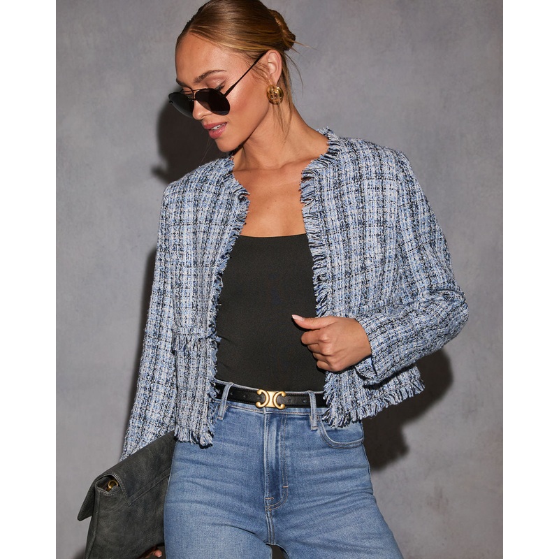 Meet the Jullian Frayed Tweed Jacketa perfect blend of timeless elegance and contemporary edge. This chic layer redefines classic tweed with lightly padded shoulders for a tailored fit and frayed trims that add just the right amount of modern flair. The open-front design makes it effortless to style, while functional front slip pockets bring both charm and practicality.